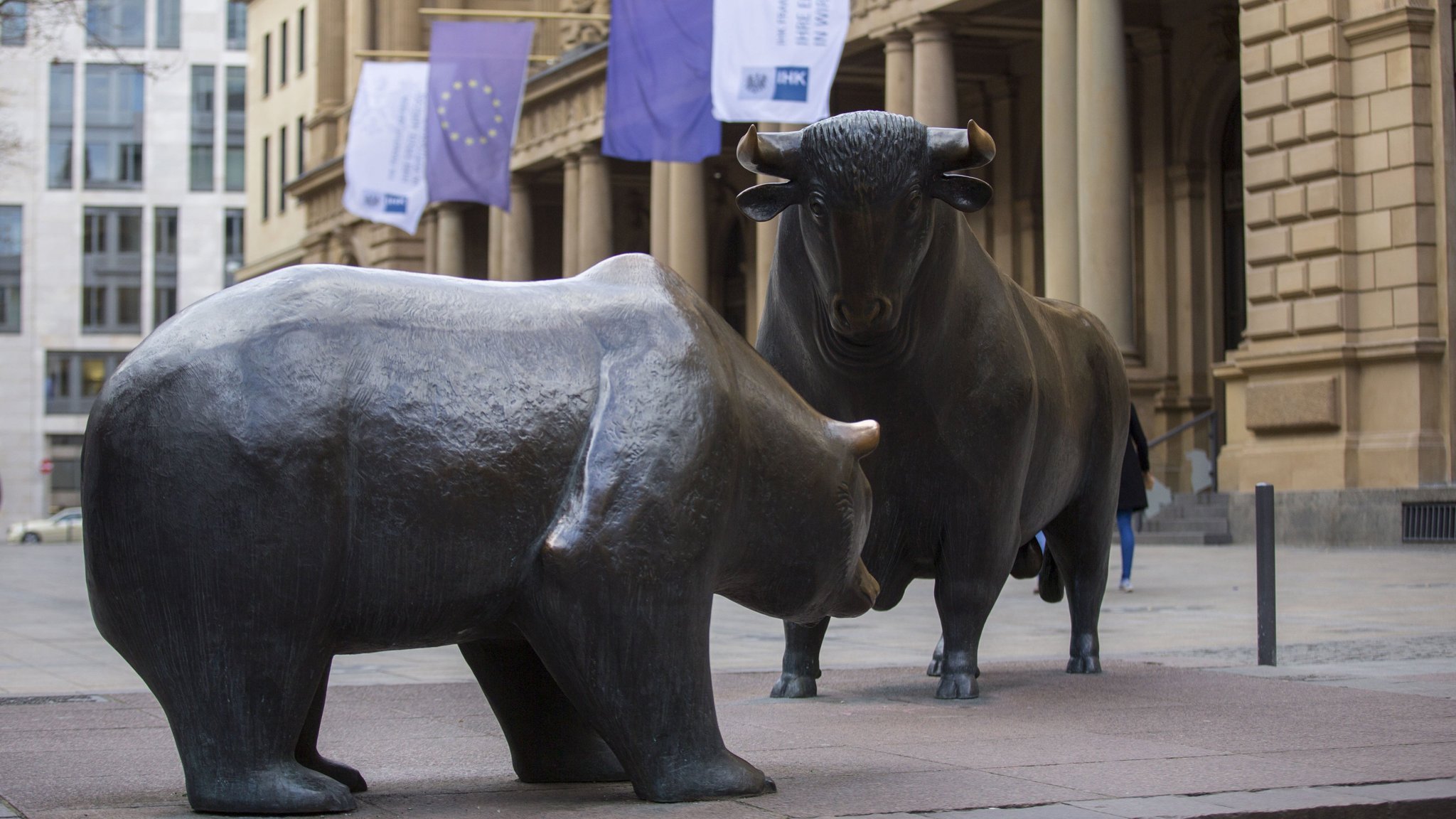 Direkt vor dem börsengebäude in frankfurt stehen bulle und bär, die börse frankfurt. Skulptur bulle und bär vor der frankfurter börse von reinhard dachlauer.